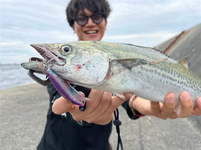 今回も青物を狙って直近で好調だというポイントへ行ってきました。 すると15分程でステイ中にひったくられるようなアタリ! しかしフッキングせずポロリでした。その後もアタリのあったルアーを 中心に探っていると、またもステイ中に水面を割って派手なバイト! 今度はフッキングが成功し無事ランディングできました。