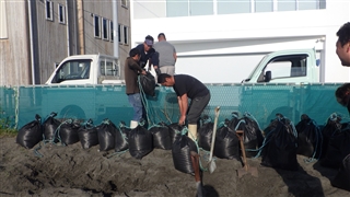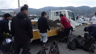 4月14日は横須賀市の「湘南漁協佐島支所」様のアオリイカ産卵床設置作業に行って参りました。 アオリイカのティップランエギング船の船長さんたちがメイン。年々メンバーが増えています。 「佐島支所」様では、このメンバーが連絡を取り合い、釣り船業務が終わった午後の時間を 利用して、「土嚢製作」・「モウソウダケ伐採」・「モチノキ伐採」までの事前準備を済ませて、 4/14に産卵床の作成と投入を行いました。 4月3日は土嚢つくりに参加しました。一つ40キロ以上の土嚢を40個作成。皆さんの規格外のパワーに驚きました! 作成した土嚢を軽トラに乗せて久留和港へ運びます。 4月5日は竹林で竹を切り出し、久留和港へ運搬します。