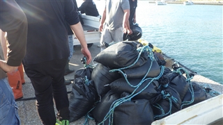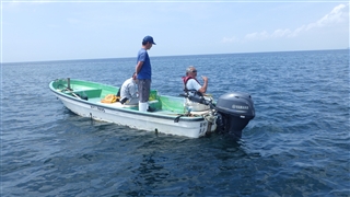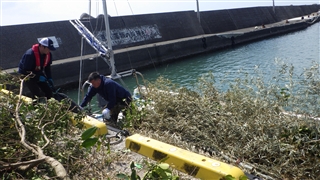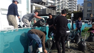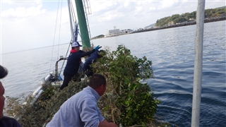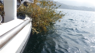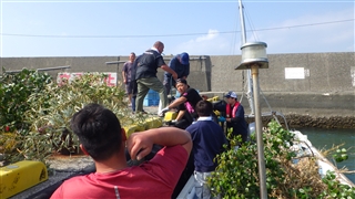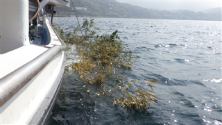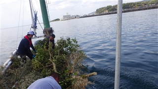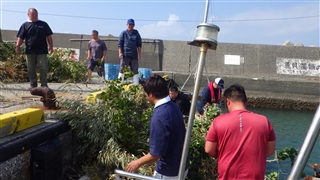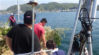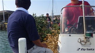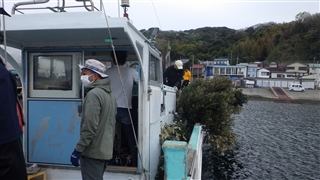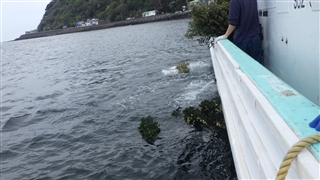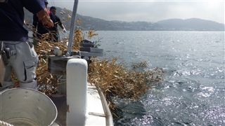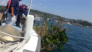 4月14日、運搬した竹とモチノキをロープで縛り、産卵床を作成していきます。 作成した産卵床2基と土嚢4つを船に積み込んでいきます。 いざ、出航です。まずは「長者が崎」の沖合いへ向かいます。 魚探で水深や位置を確認しながら、投入箇所を決めていきます。投入場所が決まったら、投入です。 2基投入し終えたら、また港へ戻り2基積み込み、次の投入場所へ向かいます。 次は秋谷沖へ投入です。 この作業を繰り返していきます。 続いて佐島沖へ投入。 魚探で水深と場所を綿密に確認しながら、次々と投入。 今回は全部で14基の産卵床を10か所程に投入しました。 海洋高校の先生が来てくださり、水中ドローンで、投入した産卵床の様子を撮影して 見せていただきました。 今回は過去最多の14基を作成・投入しました。アオリイカの卵がたくさん付くのが楽しみです!