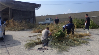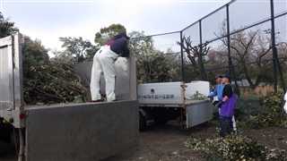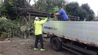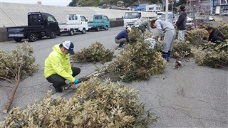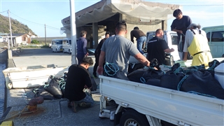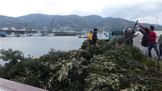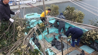 例年通り静岡県伊東市の「いとう漁業協同組合」様が実施する、 アオリイカ産卵床設置活動が、4月7日(火)に実施され、中川、石田の2名で お手伝いに行って参りました。 早朝5時に出発し、集合場所の静岡県伊東市「小室山公園」に8時過ぎに到着。 早速、間伐材のトラックへの積み込みをお手伝いします。 この日は「伊東本所」「網代支所」「宇佐美支所」「川奈支所」「富戸支所」の5支所の 組合員さんが一堂に集まって、アオリイカの産卵床の製作、投入作業までを行います。 朝8時半、各支所から大小さまざまなトラックが「小室山公園」に集結し、間伐材を積み込みます。 積み込んだ間伐材は各支所へ運ばれて行きます。私たちは「伊東本所」の作業に参加しました。 間伐材を降ろし、いい感じの枝を組み合わせてロープで束ねて産卵床を作成します。 並行して、土嚢作りも開始です。作成した産卵床と土嚢を船に積み込んでいきます。 海へ投入しやすいように産卵床と土嚢を積み込み、産卵床と土嚢を結んでいきます。 船いっぱいに積み込んだら出航です。 設置は港から出たすぐのポイントでブイを目印に産卵床→土嚢の順に次々と投入します。 最後1基を投入して、すべて産卵床の投入が完了しました。 いとう漁協の皆様お疲れ様でした。