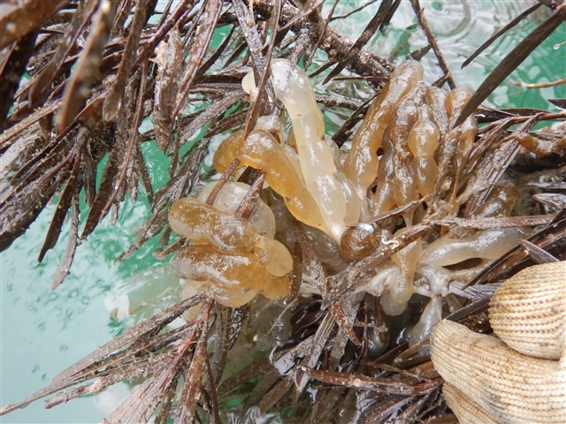 4月22日(木)に設置作業を実施した、みうら漁業協同組合 諸磯支所本間さんより、 その後の状況のご報告を頂きました。 水深8m程の浅場に、吊り下げ式に4基設置した産卵床をそおっ~と引き上げてみると・・・? 付いています!アオリイカの卵です!! ただし、付いていたのはこの1基のみで、卵が真っ白いところを見ると、 まだまだ、アオリイカの産卵は始まったばかりのようです。 4月22日に設置してから3週間、「マキ」の葉っぱは全然落ちていません。 ほかの産卵床にも、さらにたくさんのアオリイカの卵が産み付けられることを 祈りましょう! 本間さん、ありがとうございました。 YAMARIA Corporationでは、「アオリコミュニティ」活動を通じて、