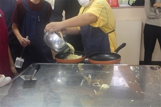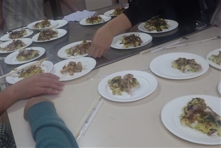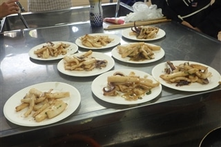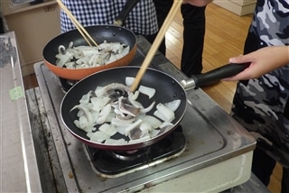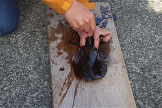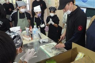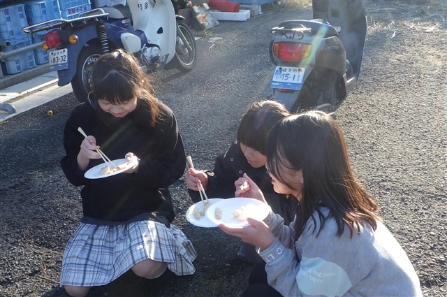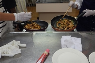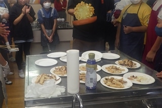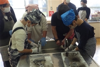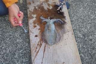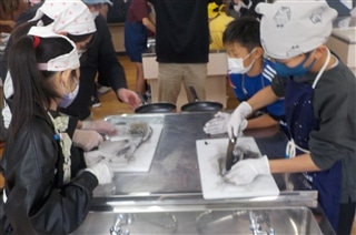 「みうら漁協諸磯支所」様には、2018年からこの取り組みにご賛同いただき、ご協力頂いてます。 そして、2023年からは、「(公財)日本釣振興会」「三浦市海業水産課」「三浦市教育委員会」と共に、 「諸磯里海里山プロジェクト」として日釣振本部事業の一つ、「釣りを通じた環境学習」と連携し、 三浦市立名向小学校6年生を対象に、「アオリイカ産卵床の製作・設置」を、総合学習に取り入れて 来ました。 今年も、5月に6年生26人が、校庭の「マテバシイ」の剪定材で作った、15基の「アオリイカ産卵床」 を、諸磯沖に設置。6月に予定されていた、「諸磯漁港」での[釣りによる生き物調査」と「産卵床に 産み付けられた、「アオリイカの卵の観察」は残念ながら中止となってしまいましたが・・・。 生徒達からの「アオリイカを食べてみたい!」の声に、「三崎観光株式会社」様にもご協力頂き、 2024年に「アオリイカ食育授業」が実現、今年で2年連続の実施となりました。 11月21日(金)の5時間目、まずは家庭科室に向かう渡り廊下で、当日の朝獲れたはかりの、 「活きたアオリイカ」の観察です。初めは恐る恐る手を出しては引っ込みていた子も・・・、 初めて触る「アオリイカ」に大興奮!! そして、家庭科室へ移動。「アオリイカ」の事を軽~くおさらいした後、昨年と同じく「三崎 魚市場食堂」の松本さんのご指導の下、「アオリイカ」をみんなで捌きます。 包丁の刃の入れ方、引く時に切るなど・・・、初めての事ばかり。男の子のほうが積極的? この日のメニューは、「アオリイカのガリバタ炒め」と「アオリイカ入りお好み焼き」、みんなで ネットで調べて決めました。2班に分かれてそれぞれのメニューに挑戦します。 バターを溶かして、火が通ったらガーリックと醤油で味付け、こちらは、少し濃い目の味かな? 「アオリイカのガリバタ炒め」完成!いい匂い!!こちらは「アオリイカ入りお好み焼き」材料。 小麦粉・卵・キャベツを入れて、よく混ぜます。フライパンに流し入れたら・・・、 蓋をして焦げ目がつくまでじっくり焼きます。応援の父兄の「返し技」に大歓声&拍手喝采! 「アオリイカ入りお好み焼き」も完成!! 小皿に盛ってお互いに交換して両方味わいます。 「どっちもめちゃくちゃおいしいね!?」 「ごちそうさまでした!」 名向小学校6年生のみんなも、地元の諸磯の海には、こんなにおいしい「アオリイカ」いて、 「アオリイカ」の産卵場所となる、「藻場」を守ろうとする人たちがいて、「産卵床」を作り・設置 するお手伝いをしたおかげで、春に生まれて大きく育った「アオリイカ」を、こうしておいしく 頂ける事に感謝して、後輩や家族・友達に教えてあげてね! そして将来、この活動を受け継ぎ、未来に伝えていってね!!
