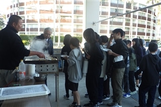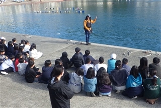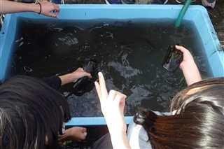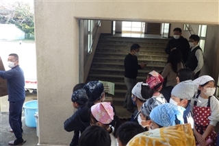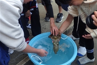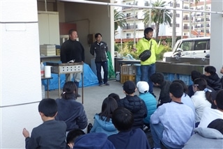 「小坪里海里山プロジェクト」様と、小坪小学校6年生とが、「アオリイカ産卵床」の製作を通じて、 身近な海の生き物や海洋環境を学び、漁業者や市役所の職員、様々な企業で海にかかわる仕事 に携わる人と、「出会い」「関りを持つこと」で、「社会の一員としての自覚を持てるように」見守って 来ました。 そして11月19日、この日は、小坪小学校6年生最後のフィールドワークが、「小坪漁港」で行われました。 小坪漁港に集合した、6年生60名。まずは、「マリンボックス100」の小林さんから、これまで の活動のおさらい、そして逗子市経済観光課の宮上さんからは、漁港利用の注意事項のおさらい。 そして、「ヤマリアエギングマイスター」川上英佑の、「エギング教室」の後・・・。 「活きたアオリイカ」を「見て」、「触れて」、水を吐かれるたびに、「ギャーギャー!」 この水槽に入れられた、3匹のアオリイカ。前夜に小林さんと川上マイスターが、北風ビュー ビュー雨の降る中、8時間かけて釣って来てくれました。 ひとしきり触りまくった後、アオリイカの「活き締め」の実演、「鮮度を保つために、一瞬で 神経を切断…。」これが難しい・・・でも、さすが川上マイスター、あっという間にイカが真っ白! さて、「締まったイカ」をもって、組合の前に移動し、プロジェクトスタッフが捌いたイカを、 近くで飲食店も営む、漁業者の「まさかり丸」の井上さんによる、「バター醤油炒め」に・・・。 校長先生もお手伝いしてくれました。とても良い匂いですね!みんな並んで!! 「めっちゃおいしい~!!!」、あっという間に食べつくしました。 みんな、目の前の「小坪」の海には、こんなにおいしい「アオリイカ」が住んでいて、「アオリイカ」 を捕る漁師さんがいて、「アオリイカ」を釣るための「エギ」を作る人がいて・・・、「磯焼け」 で海藻が無くなって、「アオリイカ」がだんだん少なくなるのを、みんなと大勢の「小坪里海 里山プロジェクト」の仲間が、今年の春に設置した「産卵床」に、たくさんのアオリイカが「卵」を 産み付けて、産まれて大きく育った「アオリイカ」をこうして、みんながおいしく頂いていると 言う事を、忘れずに・・・、そしてそのことを知らない、たくさんの人達に教えてあげてね!