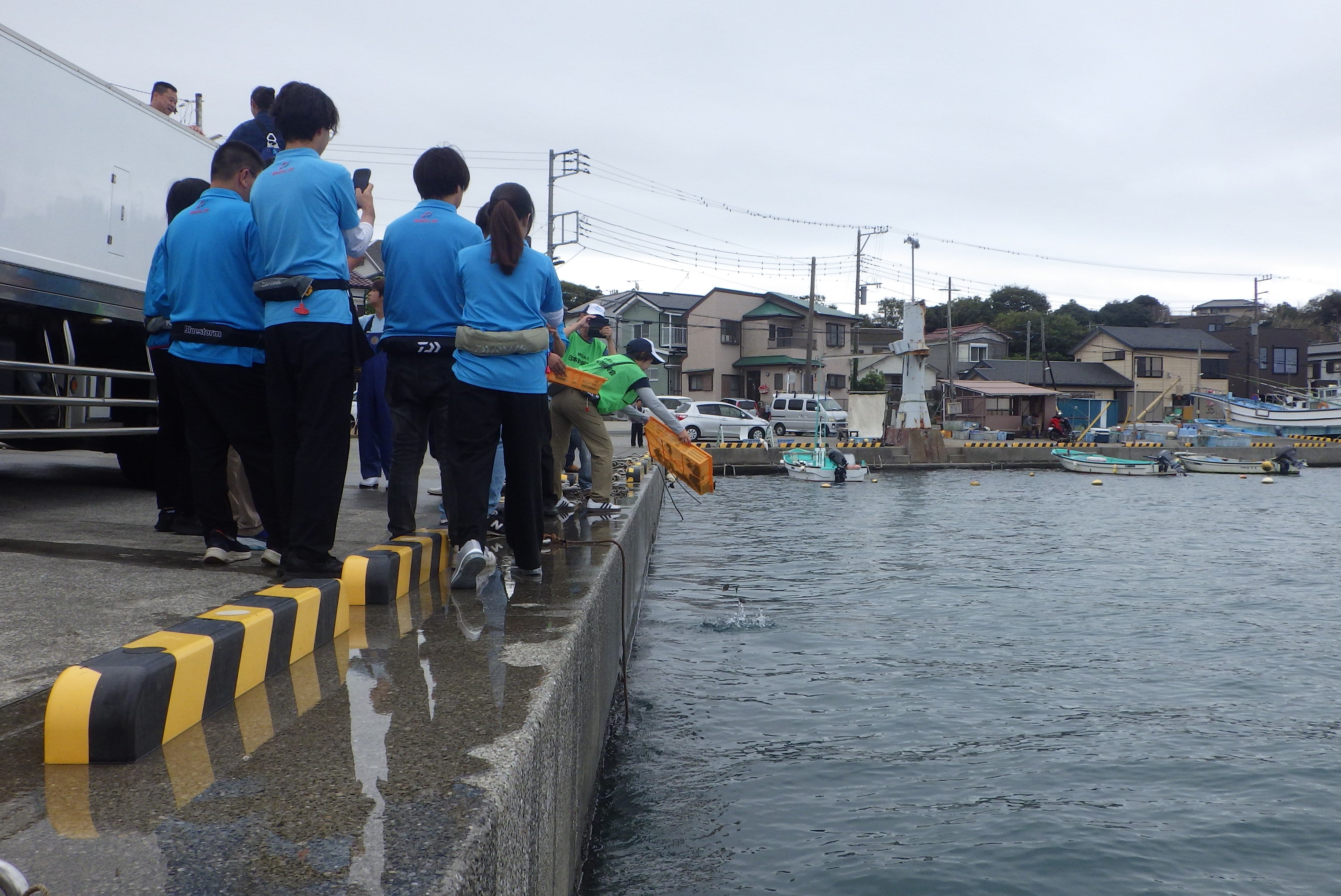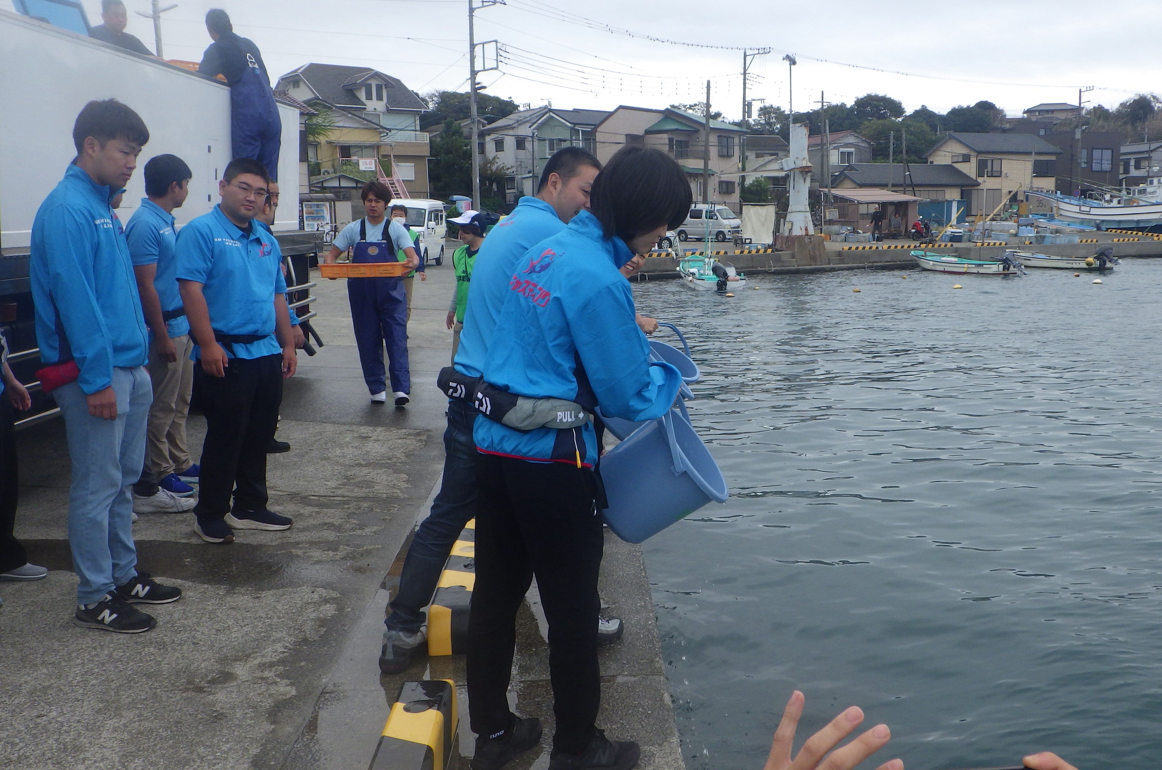 YAMASHITA Mariaが事務局を務める、(公財)日本釣振興会 神奈川県支部と、WAFA(地域の未来を考える会)の共催による「水辺感謝の日」のイベント「荒崎クリーンフェスタ2025秋」が、台風23号の接近により、中止となる中、予定されていた「カワハギ稚魚放流」は、横須賀市「長井新宿港」でスタッフのみで実施されました。「(公財)神奈川県栽培漁業協会」様に用意して頂いた、全長60㎜程のカワハギの稚魚4,000匹を放流しました。この日は神奈川県支部会員の「(株)ワールドスポーツ」様からも、このうち1,000匹のカワハギ稚魚のご協賛と、県内各店舗から11名のスタッフ様に、放流をお手伝い頂きました。最後は水と一緒にバケツで放流をして、終わりました。お疲れ様でした。