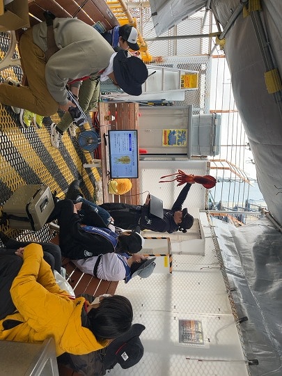 初めの座学ではエギングの基礎的な部分を1から学んでいただき、皆様モニターのイカとエギや実際のエギを確認しながら真剣に学んでおられました。