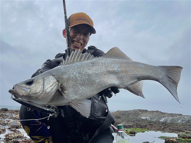 この日は翌日に備えて早めに就寝。 DAY3 前夜からの風でサラシも十分!! 前日下見したポイントを何か所かランガンしていくも、切れ藻やゴミだらけでなかなか ルアーを通せず、反応がとれません。 前日の雨の影響もあり海の色も濁っています。 そこで、以前高知に住んでいた先輩の言葉を思い出します。 「雨が降ったら、河口でヒラスズキがカエルを食べているよ」 カエルがベイトになっているかはわかりませんが、思い切って濁りのキツい河口絡みの磯へ! カラーは最もカエルに近そうなカラーのサラシグリーンを選択(これは冗談ですが、チャートと 側面のホロとのハイアピールな明滅を狙ってみました)。 魚に見つけてもらいやすいようにジャーキングを織り交ぜながら、流していくとすぐにヒット!! 絶対にバラしたくないので、丁寧に丁寧にランディング!! ようやくヒラスズキをキャッチできました。