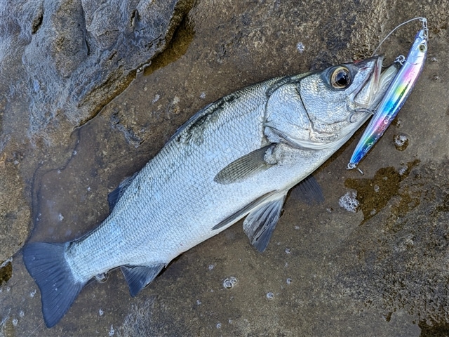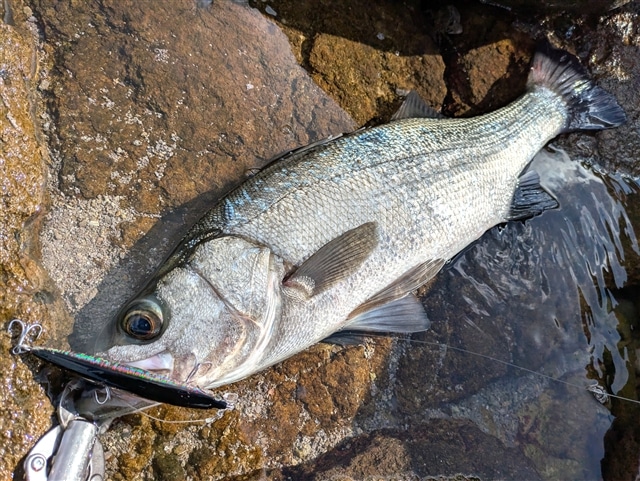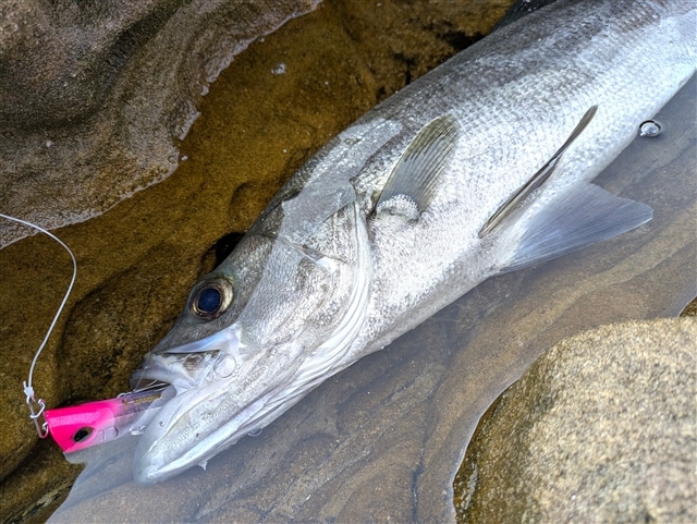 「秋だ!時化だ!ヒラスズキだ!」ということで、シーバスダービーに合わせ長崎へ。 春と違い、秋は北西風が吹く頻度が減るので、エリア選びに迷いますが、 今回は北西10mの絶好ヒラ日和。いつになく気合が入ります! 東の空が明るくなり始めた、朝マズメのゴールデンタイム。 鳥も旋回し、ヒラスズキが口を開けて待ってくれているので、手堅くチョビー先発で! 風と波を読み、サラシが広がるタイミングでチョビーを漂わすようにスローにトレース。 「さぁ来い!」と金属バイトを待ち構えていましたが、期待を裏切る無反応。 今日はやっちまった感で焦りましたが、秋序盤は青物とシーズンが絡む為、 風が吹くとベイトが寄り、青物&ヒラスズキが同じポイントに混同し、 青物優勢でヒラスズキが大人しくなり、朝マズメでも口を使わないことが稀にあります。 ここで欲張ってヒラスズキタックルで青物を狙うと、HIT&ラインブレイク、 更に場が荒れて本命サヨナラな辛い経験が何度もあるので、 「今日はそんな日なのね」と震える手を抑えながら、朝飯食べてタイミングを待ちます。 そして8時頃に潮が上げから下げに変わり、鳥のざわめきも収まりかけたので再開。 まずは足元の磯際チェックで、チョビーのスローなタダ巻きで本命HIT。