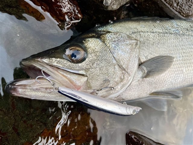 良い感じの風が吹く予報だったので、朝マヅメにヒラスズキ釣行へ! 薄暗い時間帯にワンド内のカケ上がりや沖のシモリ周りを探っていきますが、 反応は無し。 朝マヅメパワーに期待してワンドの入口付近へ移動し、サラシとは呼べないほどの 泡の中にチョビーを通すと豪快なバイト!! 焦らず魚を誘導してなんとかキャッチできました!