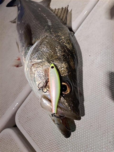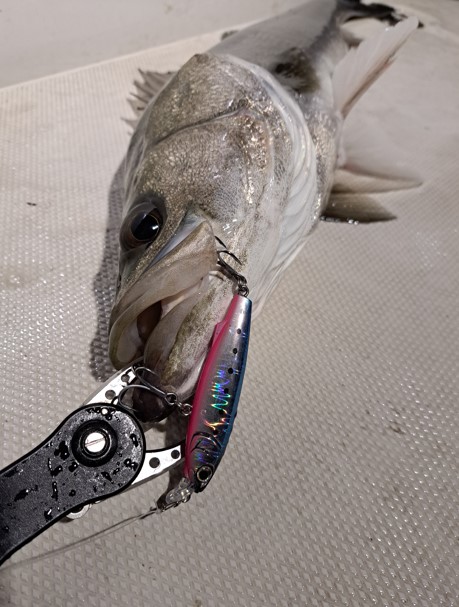 70upがなかなか釣れない今期のシーバス。 12月も中旬に差し掛かり、シーズン的にもいよいよ終盤戦。 最後の望みを託すため、今期最後のボートシーバスへ! 相変わらず持っていないところだが、当日出船する時間あたりから雨の予報。。。 寒くなったこのタイミングの雨はさすがにきついが、気圧低下で魚が 浮いてくれることを信じ、各ポイントを回っていく。 序盤はコノシロ付きの一発大型狙いをボアーで探っていくが、やはり寒くなった この状況に雨が降ったことで、魚探の反応もボトムべったりで浮いてくれない。。。 嫌な予感です。 そんな中、同船した友人にヒット! 。 。。 。。。 あれ?続かない。。。 まあそんな甘くはないか。 ここで船長から相談が。 「こんな感じで一発大型を狙うか、イワシ付きの魚を狙いに行くか、どっちがいいですか?」 正直サイズは狙いたいが魚が沈んでいるのは明白だったため、ここでイワシ付きの魚狙いへチェンジ! 大きくポイントを変えた最初のポイント。 ストラクチャーの際をタイトスラロームを岸際50cmを意識して攻めていると、 ゴッ! とこの日初めてのバイト! しっかり合わせ、軽々と魚を寄せる。。。 はずが、タックルをライトなものに変えているとはいえ、なかなか浮いてこない。 掛かりどころが悪いか、それとも良型か。 一定の深さからなかなか浮かない。 そんなことを繰り返すうち、魚が弱り浮いてきた。 思ったより長いかも。