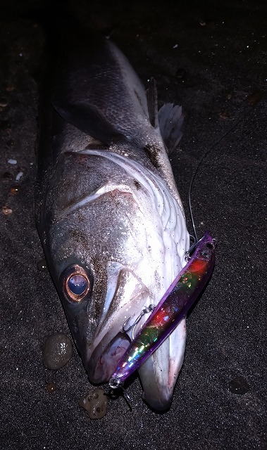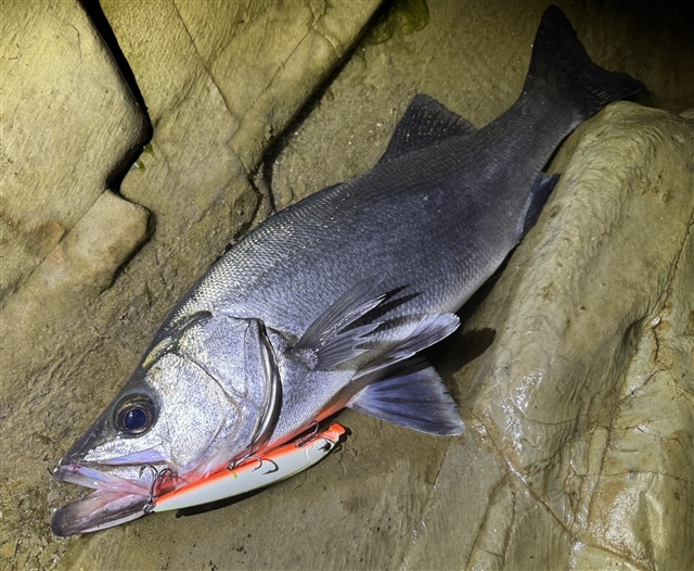 なんとか良型を揃えたくシーバスを狙いに行ってきました! 南風が強く吹いており、ウネリがいい感じに入っていて良い雰囲気。 ポイント入ったばかりの夕マヅメは足元でワンバイト。今日はいけるかもしれないと 強風を背にキャストを繰り返します。 遠くで激しく鰓洗いをしてるのが見えます。 引き上げるとカッコイイ、ヒラスズキでした! 久々の釣果なので興奮気味に写真を撮ります。