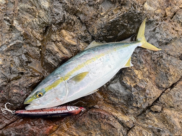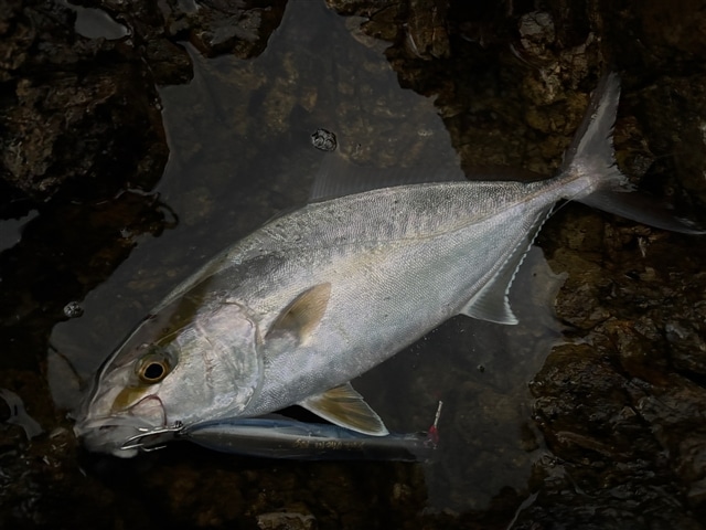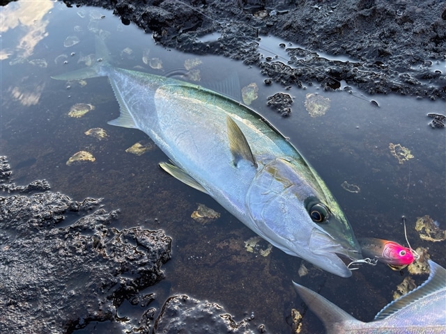実釣時間は5時間半ほどなので島について早速目星をつけていたポイントへ行ってみますが想像してた ほど流れが無く、投げ続けてもあまり雰囲気はありません。 至近距離でヒラマサが突き上げアタック! 強めのタックルにしていたので難なく寄せてくるとメーターは無いにしても90はありそうな良型!と 喜んだのも束の間 スポンッ瞬間、ルアーが宙を舞う。 頭の中には絶望の2文字。 もう回遊には期待せずとにかく足で稼ぐ作戦に切り替えるもいくら打てども響かず。 このままじゃ終われないので本島に戻ってすぐ地磯釣行するも当然無反応でした。