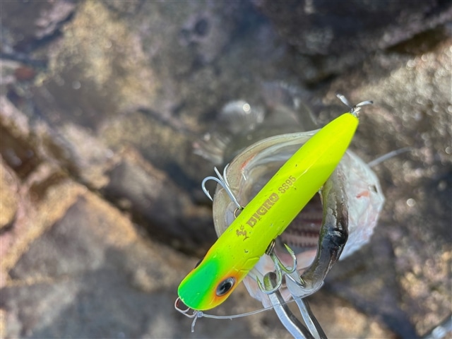 正午のタイミング、水深も浅く波も微妙なので何でこんなとこ選んだんだと自分でも思いますが、 さらにそこで磯ヒラをやってみようという奇行。なんでさっきのポイントでやらなかったんだと自問自答してしまう意味不明っぷり ともかく、わずかに広がるサラシにチョビーを入れてみるとカツン!とまさかの魚の反応!