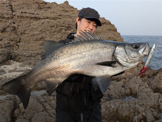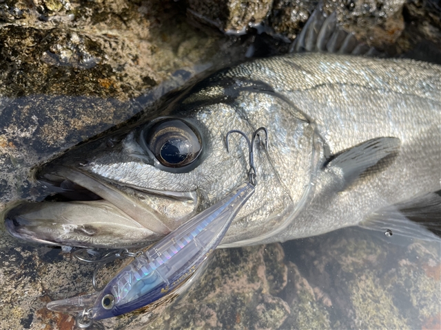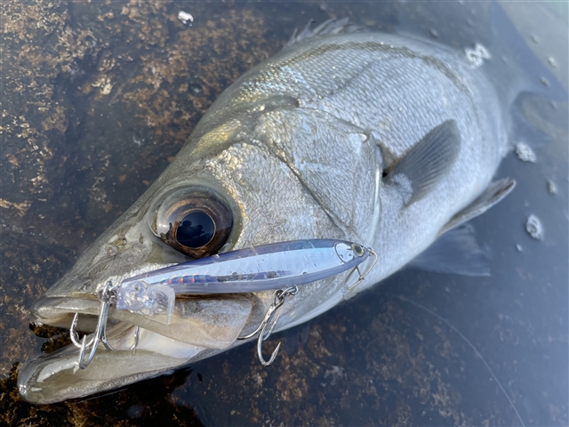 今回は久しぶりにヒラスズキ釣行へ! ただ9時過ぎには波風が落ちる予報だったので、テンポ良くランガンしていきます。 まずはシモリが点在し、払い出しもしっかり見えるポイントから。 巻き速度落とすと「ズンッ」と重たくなるバイト! 無事にキャッチしました。 開始早々から嬉しい1匹!銀ピカの魚体が最高にカッコいいです。 このポイントにはまだまだ魚がいる気配もありましたが、反応が続かないため見切りをつけて 移動すると、すぐにヒット!