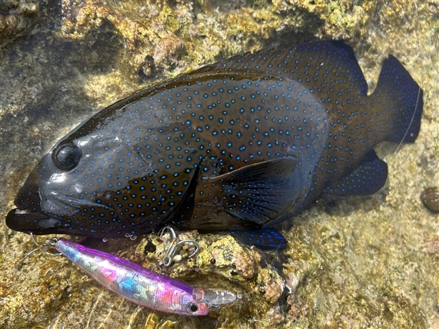ルアーの横に回り込んでヒット! 暫し、青く澄んだ魚体を観察した後にリリース。 その後、デュプレックスの新色ギラギラケイムラで引き続き探っているとまた青い魚。