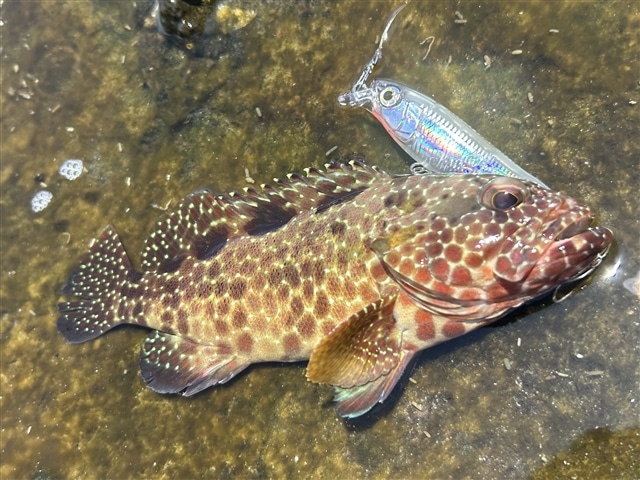 夏休みの帰省がてら、山形県庄内の地磯にキジハタを狙いに行ってきました。 めちゃくちゃに暑い日中はクーラーの効いた部屋で涼み、時合いとなる朝夕の マズメに狙いを絞っての体に優しい釣行です。 狙ったのはキャスト先でも5m程度のシャローエリア。 砂地に根が絡み海藻が生えているようなスポットです。 キジハタと言えば、テキサスリグやジグヘッドリグ、直リグといったワームを 使用した釣りがポピュラーですが… プラグで狙ったらどうなんだろう? (ニッチですがクランクを使用した釣りはありますね!) 狙って大きいのが釣れやしないか? なんて妄想を胸に、プラグのみで狙ってきました。 近距離はサウザー、遠距離はデュプレックスといったシンプルなローテーションでランガンし、 ボトムから中層までのレンジをリフト&フォールメインでアプローチ。 キャストを繰り返すうちに、地形がぼんやりと把握できたところでカウントを長めに とってボトムにタイトに寄せていくと… フォール中にバイトが出てヒット!