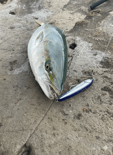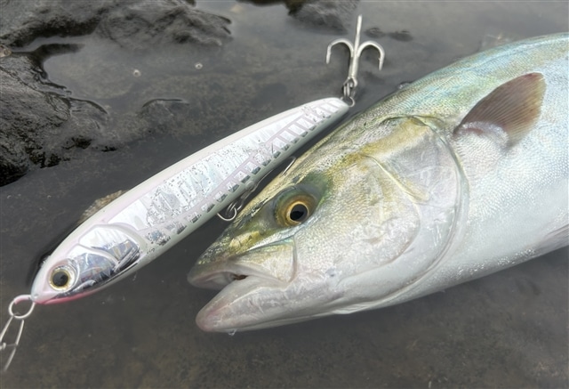 台風明けは好釣果が期待できるとのことで青物狙いに行こうかと思ってたのですが、 浅ましい考えが脳裏をよぎり、良いタイミングでポテンシャルの高い場所にいけば いつもの4倍釣れるんじゃないかと思い伊豆の沖磯に行きました。 台風明け一発目の出船で漂流物多く、うねりもボチボチ残っており青物狙いには グッドコンディションのように思えます。 朝イチは磯際をボアーでざっくりサーチ。うねりでできるサラシの下をくぐらせて いきますが魚の反応は無し。ラピードに変えて沖目を探り始めるといきなり魚のバイト! かからなかったですがシイラのようでした。小さいカツオやマグロのような魚体も見えたので魚はいるようです。 やはり台風明けは良い感じやな!と思いましたが、反応はまばらで想定より数は多くなさそうな雰囲気です。 キャストを続けると何度かバイトがありますがフッキングせず。大きな青物を想定して PE4号タックルで来たのですが、魚が思ったより大きくなさそうで魚に対してルアーが大きい感じ。 というわけでルアーサイズを落としつつアピール力があるローデッドF140に変更。 すると数投でヒット! 三浦サイズのイナダでした。 数投後に今度はショゴがヒット。