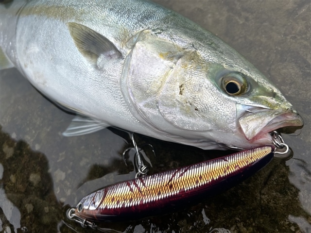 今回も青物を狙って直近で好調だというポイントへ行ってきました。 すると15分程でステイ中にひったくられるようなアタリ! しかしフッキングせずポロリでした。その後もアタリのあったルアーを 中心に探っていると、またもステイ中に水面を割って派手なバイト! 今度はフッキングが成功し無事ランディングできました。