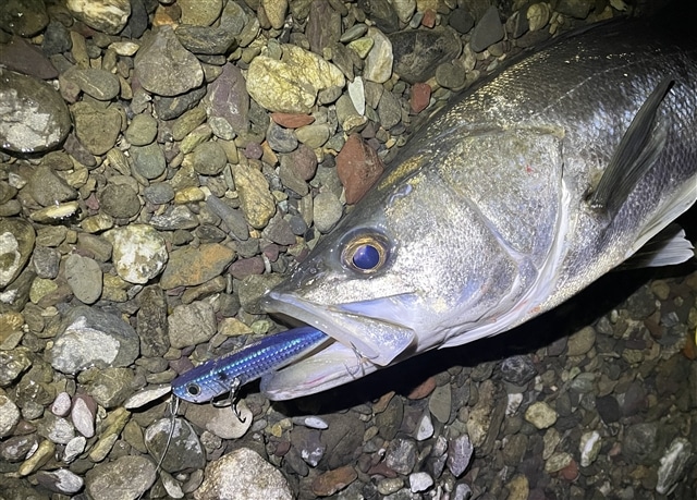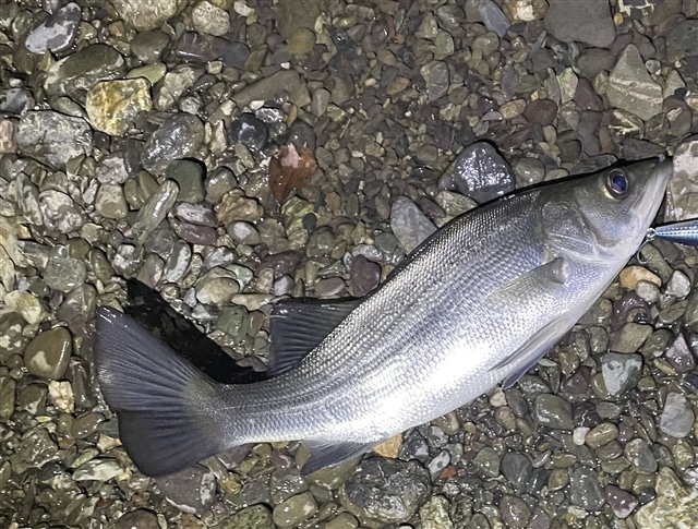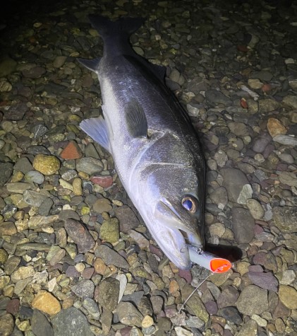 なかなかランカーサイズに出会えない日々が続く。 時期も終盤だが再び川に残っている大型に狙いを絞って河川をランガンすることに。 今回は行ったことがない、いわゆる新規開拓の釣り。 最初のポイント。マップでは明確に落ち込みがあり、落ち鮎を待っている魚がいるはず。 朝マヅメに入りたいが新規ポイントのため、エントリールートもわからなければ、 そもそも打ちたい場所までたどり着けるかもわからない。 そのため、朝マヅメから少し明るくなったタイミングでエントリーを試みる。 こっちでもない、あっちでもないと彷徨いながら、やっと打てる立ち位置へ移動。 まずはエンゼルキッスで高活性な個体がいないかと広く探る。 が、これには反応無し。 次にチョビーを投入。 落ち込みの流れに乗せてナチュラルにアピールするも、これも反応無し。 次はビグロを投入。 圧倒的キャスタビリティで落ち込みの対岸に近い側を狙う。 着水。 流れに乗せて、2回ルアーを左右へ振るためにトゥイッチ。 からのステイで再び流れに乗せる。 これを繰り返す。 何回目かのステイ後、ゴンッと明確なバイト! すかさずフッキング! そしてエラ洗い! シーバスなのを確信。 瀬に巻かれないよう流れに乗せるように魚を誘導し、取り込みやすい場所へ移動。