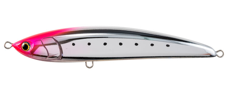 着水後はセンター重心に戻り、水平に近いスイム姿勢は高速リトリーブに対応し、トビウオやサンマなどの水面で動きが速いベイトを捕食しているときや、日中・ベタ凪時の警戒心が高まるタイミングに有効。