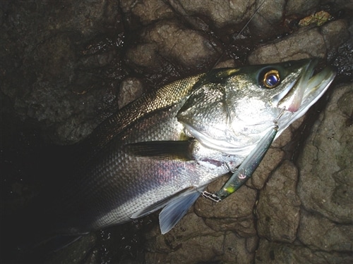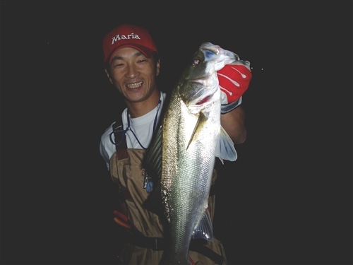 雨で増水した川に遡上したシーバスを狙い虫よけスプレーを片手に深夜の河川をウロウロと… 意外な場所に魚が入っていることもあり シーバスの行動パターンの大胆さを垣間見る事もあります。 使用するルアーはトップウォーターやシャロー系のミノーがメインとなり 深夜の河川で心地よいドラッグ音が響きわたります。 真っ暗闇の中で目をこらし、水辺のブッシュに引っかからないようにキャスト! 立ち位置によってアプローチアングルやリトリーブスピードを コントロールし流れのヨレや落ち込み、かけ上がり等といった魚の「着き場」を探していきます。 パターンに、ハマればファーストアプローチでバイトを得られる事も珍しくはない為 慎重なアプローチがキモとなります。 ファイト中に川の流れにのって走りだしてしまうと 魚のサイズを錯覚してしまうほどの重量感になり、その緊張感にヒヤリとする事もあります。