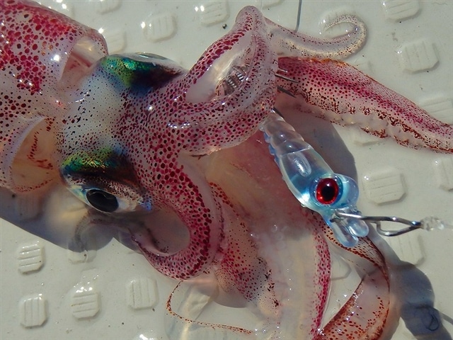 周年イカの事を考えているMASAとして 妄想していることとして イカの「餌をとる事」にはある一定の法則があります。 それは・・・ ・「襲われないようにするためには大きくなる」 ということです。これはイカ類に限らないことだと思いますが、 これによりイカは次の捕食行動を起こします。 ①胴長(全長から足を除いた筒状の部分の長さ)までの長さは捕食行動を行うことが多い。 ②食べることが出来るのであれば、大きい餌を狙う。 ↑このように足を広げたらなかなか大きな餌を捕まえられる訳です。 ではBLOGを読んだお客様は「???」となったと思います。 ではなぜここで「チビエビ5」から「チビエビ7」ではなく、「チビエビ3.5」なのか? 理由は・・・確かにイカは①②の行動を起こします。ですが、それは「イカが襲われることがない」 という条件付です。 だって、大きくなれる事でも「食べられてしまえば」元も子もないですから・・・・ そこでもう一つのイカの捕食行動があります。 ③すぐに食べれる大きさの餌を選ぶ 俗にマルイカで言われる「アミエビパターン」です。 目安として「足の中に納まる長さの餌」は③に該当するようです。 この捕食行動に対応し、「実釣」を元に今回リリースするのが、