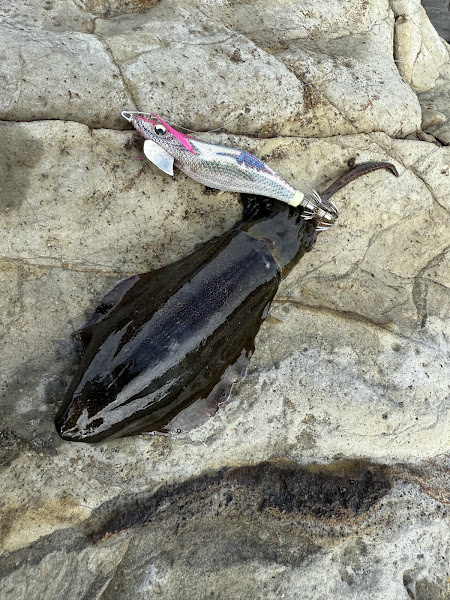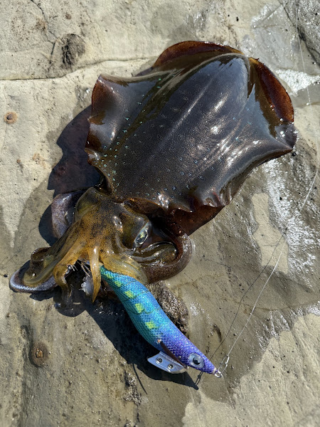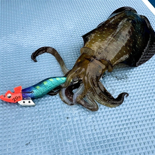 10月に入りティップランエギングシーズンも本格化。 サイズも上がってきています。 朝イチ本命ポイントは下げ潮に加えて北風。 特にケイムラ、紫テープはサバフグに反応が極めて良く、 そこで、サバフグに見つからないようなカラーローテーションの一つとしてKのTRカラーの ブルーテープに変更すると、サバフグの攻撃がかなり落ち着きました。 しばらくこちらのカラーで続けているとヒット! やはりサバフグ避けにも一定の効果はあるようです。 ブルーテープのおかげで何とか形になりました。 |