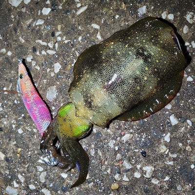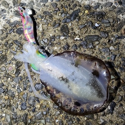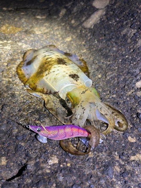 深夜の三浦半島南部岸壁へエギングに行ってきました! 当日は深夜の到着に加え、悪天候予報だったこともあり、狙っていた釣り場に すんなり入ることができました。 そして、キャストを繰り返すこと数投―― 微妙に流れる弱い潮の中で、「モゾッ」としたアタリがあり、ヒットしました! その後も同じパターンで、久しぶりの連続ヒット!!