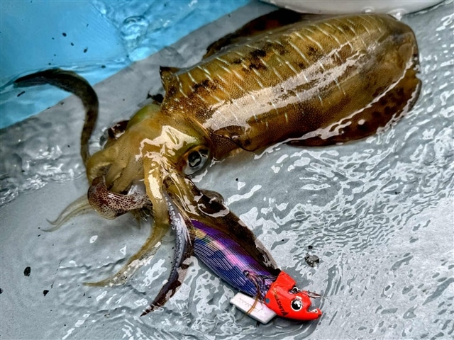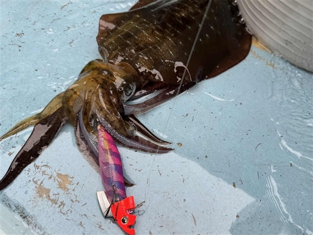 アオリイカの場合、時化後に良いケースが多いのですが、 今回は剣崎沖では最も実績高いパープルパープルで3キャッチ。 |