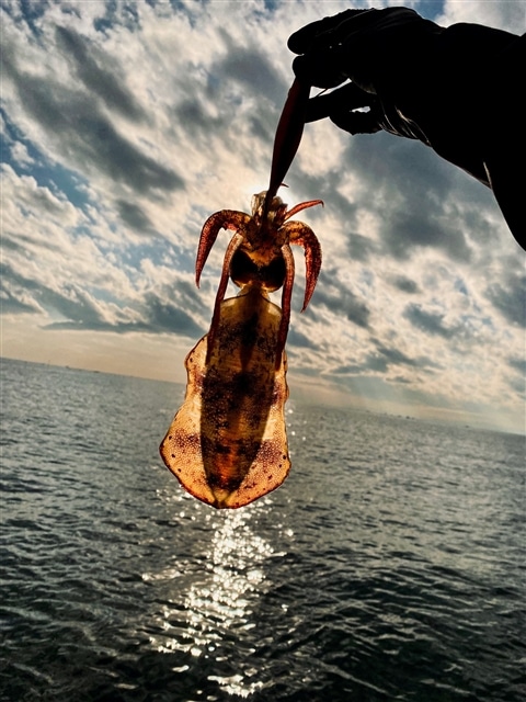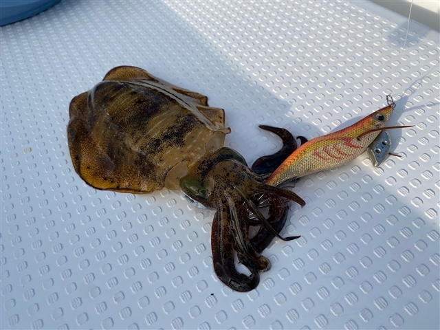 今季初のティップランエギングに行ってきました。 天気予報では穏やかな天候だったはずが、現地はやや強めの風。 30mラインからスタートしました。 シャクって、ジーっと穂先を見る。 なかなか乗らない状況でしたが、パンチのようなアタリの後、 再びフォールを入れると糸と竿に違和感。 足1本だけ掛かっており焦りましたがどうにかネットイン。 個人的にモンゴウイカの味が大好きなので、ある意味“本命”です! ぱんぱんに膨れたコウイカに墨を浴びないよう慎重に記念撮影。