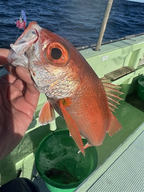 今季は夏場からカンネコ根のアカムツが数年ぶりに絶好調。 ややうねりある中、ポイントまでは約1時間。 ポイント到着し釣りスタート。 エサはホタルイカのツボ抜きのみ。 出ることがあるため、仕掛けは派手に、エサはコンパクトにが定番です。 最近はあまり派手に動かさない方が良いと、船長から朝のアナウンスがあったので、 潮の流れも緩いため、時折根歩きさせるために大きく竿をあおって 再び落とし込む要領で誘いをかけます。 すると朝イチはアカムツの活性高く、コンスタントにアタリあり。