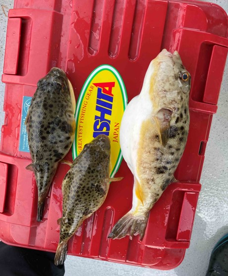 今シーズンも開幕と知ったので今年初のアカメフグに挑戦してきました。 少し釣りずらいかもしれないが北風は大丈夫との事で16名の満員で出船になりました。 いつもの通り、港を出てすぐの垂水沖堤防周辺、水深7~8Mからスタート。 エビエサをつけて落とすとすぐに金属的なアタリが出ます。ベラ各種の猛攻ですぐにエサが 無くなったり、掛かってきます。 そんな状況のなか、あわせを続けていくと10㎝程度のショウサイフグやコモンフグがポツポツと混じり、 ちょい小さ目なアカメフグも顔を出して一安心。 船長より追加を購入して釣り続けていきます。 アタリが遠のきやはりエビにはかなわないようです。 その後本命を2匹追加して納竿となりましたが、まだまだ始まったばかりですのでまた機会を見ていってきます。 |