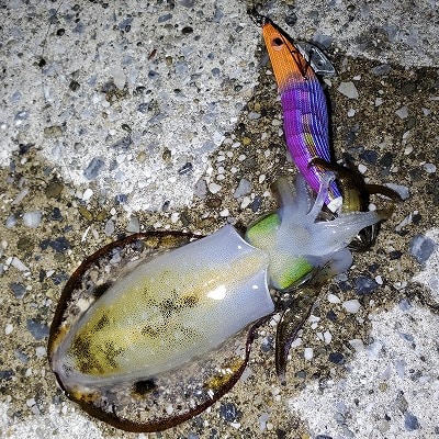 さらに足元でピックアップ際に3杯くらいのイカが姿が見えたものの、再投入時には その群れを逃し…潮の低下とともにチャンスも薄れて無反応状態へ… 情報によるとまとまった数釣れている情報もありますので、潮位の高めの日・タイミングに 入れると吉かなと思います。 |