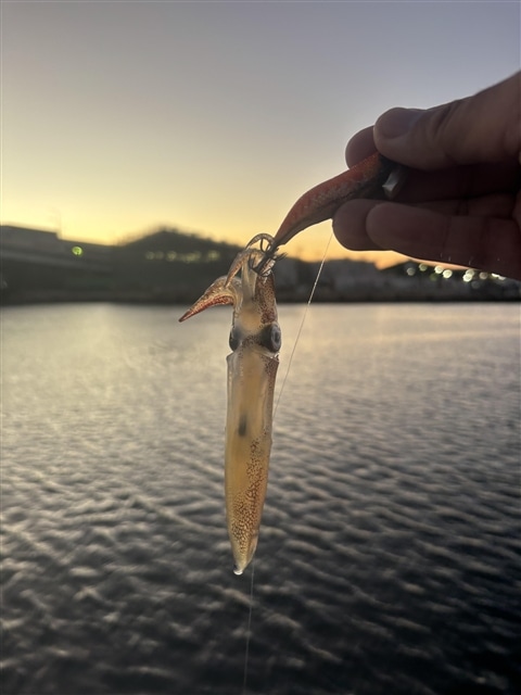 千葉市方面の好調ヒイカの広がりを調査。千葉市より西の湾奥方面にある、 過去良く釣れていた船橋市の公園の釣り場に夕方入りました。 日中に満潮でどんどん潮位が下がる潮回りだったので時合は夕方の短い一時か?と 予測しながら第一波の回遊を逃さぬように比較的明るいうちから開始。 少し風があったので1.8号ベーシックタイプの沈む力を利用して、ベタ底を探るスタイルで 広範囲に投げていましたが、ベイトっ気も少なく反応なし。 日が沈んですぐ第一波の回遊があり、エギにヒット!