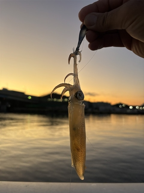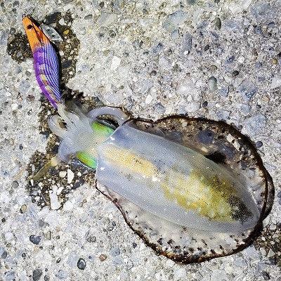 ここまで4杯でマヅメの時合いが終了。 やがて暗くなり常夜灯の明かりが効いてきた頃、イカの群れが数杯回遊してきたのが 見えたので近くにエギを投げ込むと5杯目がヒット。見えイカはいなくなりました。 しばらくするとベイトフィッシュの群れが港内に侵入してきました。 サイズのいいヒイカは魚食性が高まるので、魚付きのイカを狙うためアクションを派手目に、 回数を多め、早めに誘うとドスンとストライクで6杯目がヒット。 その後はベイトフィッシュも遠ざかり、潮位低下で気配がなくなり納竿しました。