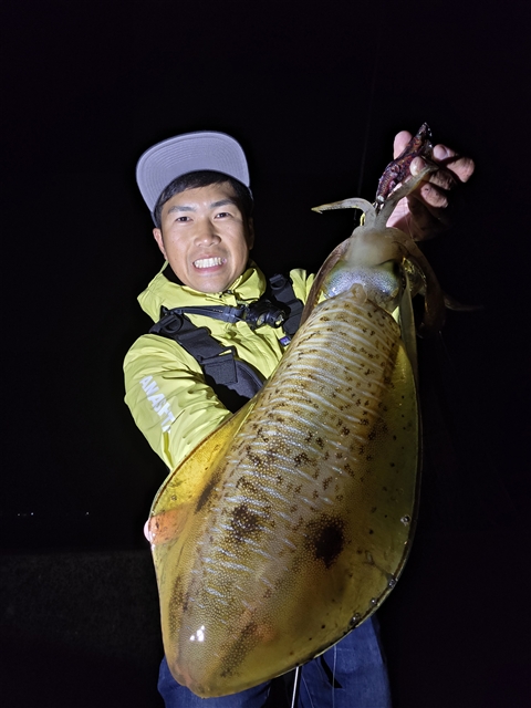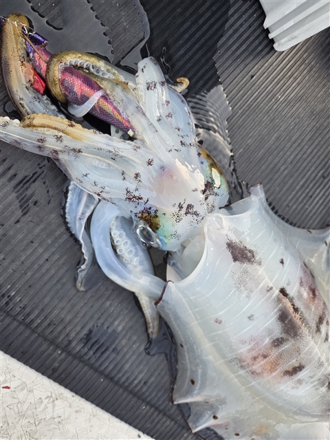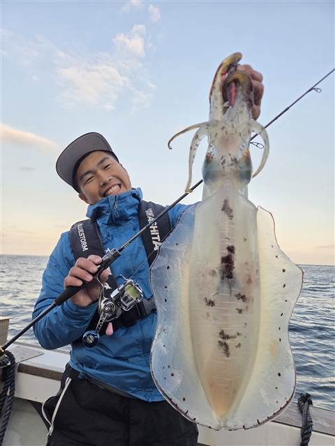 ティップランではキロサイズまでしか釣ったことがなく、自己記録更新サイズに大興奮!! 歓喜のあまり、突き上げた拳が船の装備品に当たり打撲したのはヒ・ミ・ツ(笑) その後、ポイントを少し移動させて狙っているとまたも同サイズ?がHIT!! これまたドラグがどんどん出されていきます!! このエリアどうなっているか?と思ってしまうほど、コンスタントに釣れていく。 上がってきたのはキロ後半の良型のアオリイカ!!