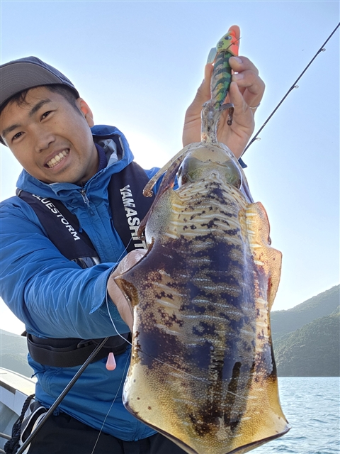 久しぶりに長崎県五島の福江島に行ってきました。 担当時代にお世話になっていた翔龍丸さんでティップランが好調との 話があり乗ってきました。 福江島の玉之浦地区からの出船で基本的には玉之浦湾の湾内ティップランが メインですが、凪の日だけ湾から外海に行ける感じです。 たまたま天候に恵まれ、この日は凪ということもあり急遽予約し外海での ティップランに初チャレンジ。 水深は25~30m前後。スタートのタイミングは潮止まり前の潮が緩むタイミングで、 船長から釣りやすいタイミングとのこと。 早々にイカからの反応が!! 激しいイカパンチでHITには繋がらず。。。 すぐに軽くシャクりを入れて止めているとロッドティップのテンションが抜けるアタリ!! アワセが決まるといつもより強めに設定していたドラグがどんどん出されていきます。 初めてティップランで経験するイカの強い引きに手が震えます。 ショアエギングロッドより短いティップランロッドはイカの引きをダイレクトに味わえますね!! 上がってきたのは2キロ近くあるだろうアオリイカ、無事にランディング成功!