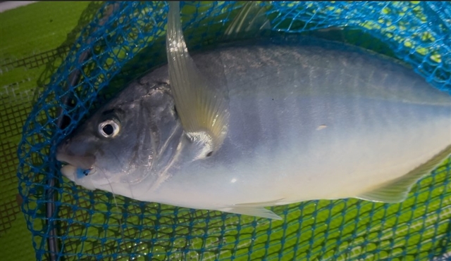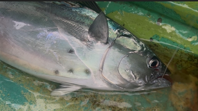 ヒットパターンは3本針仕掛けの黒目付き青ウイリー。 数投後、底から5mでステイさせていると再び強烈なアタリ。 締め直して応戦し、底での粘り合いを制して浮かせた瞬間、 ここで朝のシマアジタイムは終了。