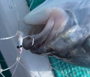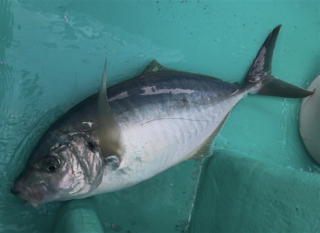 ライトを使用せずとも道糸で水深を把握できるようになったタイミングで、16mから誘いを入れ、 11mでステイさせたところ、仕掛けがモタれるようなアタリが出ました。すぐにフッキングが決まり、 スピニングタックルの利点を活かして主導権を与えずやり取りを行い、1.4kgの本命シマアジをキャッチしました。