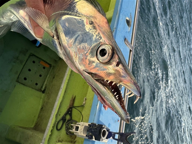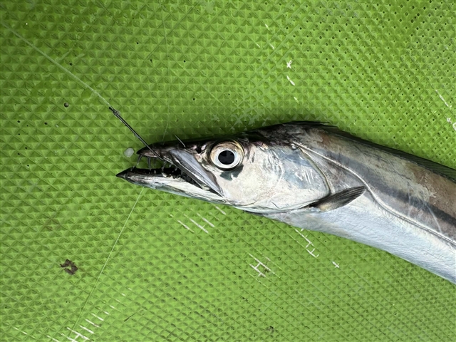 時間経過とともに下げ潮が強くなると、その反転流が中層に留まるのか大きな潮境ができて、 潮境の中をタチウオが活発に餌を追う状況になり、入れ食い状態に。 用意した20尾のイワシは昼には底を尽き、22本のタチウオをキャッチしたところでテンビンにチェンジ。 アタリは活発なものの、イマイチ追いが悪くアタリがあっても齧って終わりという状況がしばらく続きます。 細かめ強めのシャクリと長めの止めに対しての反応良く、沖上がり直前で連発。