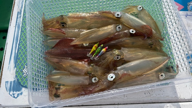 後半は大きめシルエットの『スクイッシュ7-1』ドピンクを寄せ角に使用。 その上下にセットした角に乗る展開が目立ち、 特に『スクイッシュ5-1』バチバチレモンが高反応でした。大きめで寄せて、 コンパクトで食わせる——この組み立てがうまくハマった一日でした。 小さなアタリを掛け、ズシンと重みが乗る瞬間はやはり格別。2026年マルイカシーズンは 好スタートを感じさせる内容です。 ぜひ「スクイッシュ」とともに、今シーズンのマルイカゲームを楽しんでみてください。