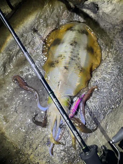 前回の釣れた釣行からちょうど一回り。 釣り場に到着し、エギングスタート! 負けじと投げ続けていると、キャストすぐの着底からのひとシャクリ後、 竿先に違和感を感じ、合わせると気持ちいい重み!