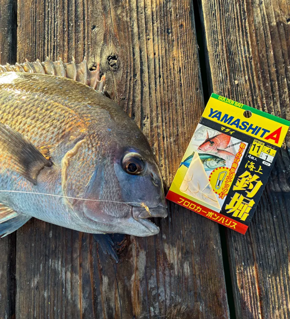 1投目からマダイがヒット。手早く抜きあげて2投目ですぐさまヒット、3匹めまでは同じような感じですぐに取れました。