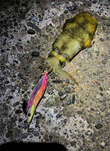 アオリイカを狙いに行ってきました。 なんとか空いている場所を見つけて釣り開始。 18時半頃、良さげなポイントが空いたので移動。 小さいですが、初のアオリイカです!