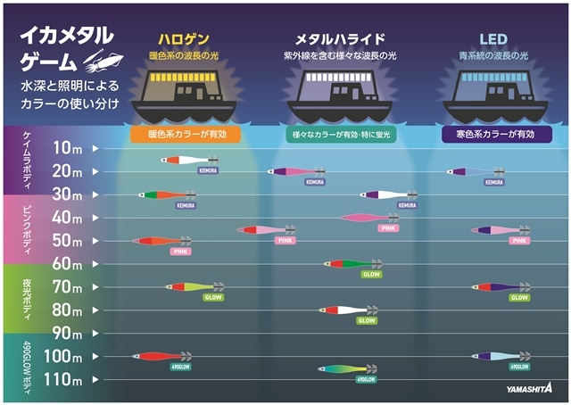 490GLOWというのは、YAMASHITAのテクノロジーの一つとして提案している夜光のひとつで、490nm(ナノメートル)の波長の光を放ち、海中が暗い状況下で、イカの視覚への効果的なアピールを実現します。実際に、イカメタルやオモリグの釣りでは集魚灯を灯し、強い光量が海中に照らされてはいますが、水深が深い場合や船の周り、船の下に関しては光が届きにくく海中が暗い状況が多々あります。通常の夜光よりも目立つとされている490GLOWは夜間のアピール力をうまく活用してイカを寄せて乗せることができるのが大きな利点です。