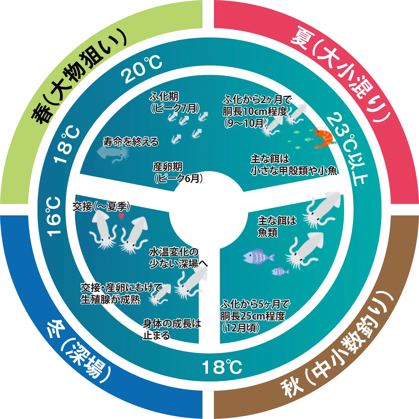 最大で4kgを超える大きさになるアオリイカ。わずか数ミリメートルの卵からのふ化で始まるその一生は、日本の四季変化・水温変化と密接に関係しています。