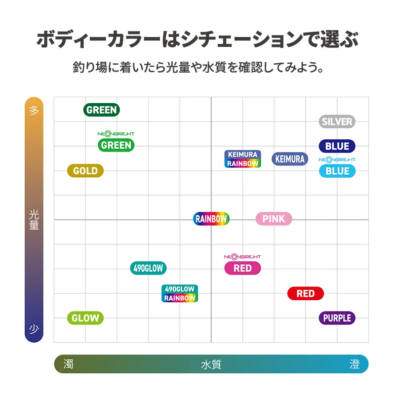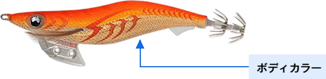布の下のエギの本体部分の色を指します。エギ王シリーズには、さまざまなボディタイプが存在し、それぞれのタイプによって、イカへのアピール力やアクション特性が異なります。